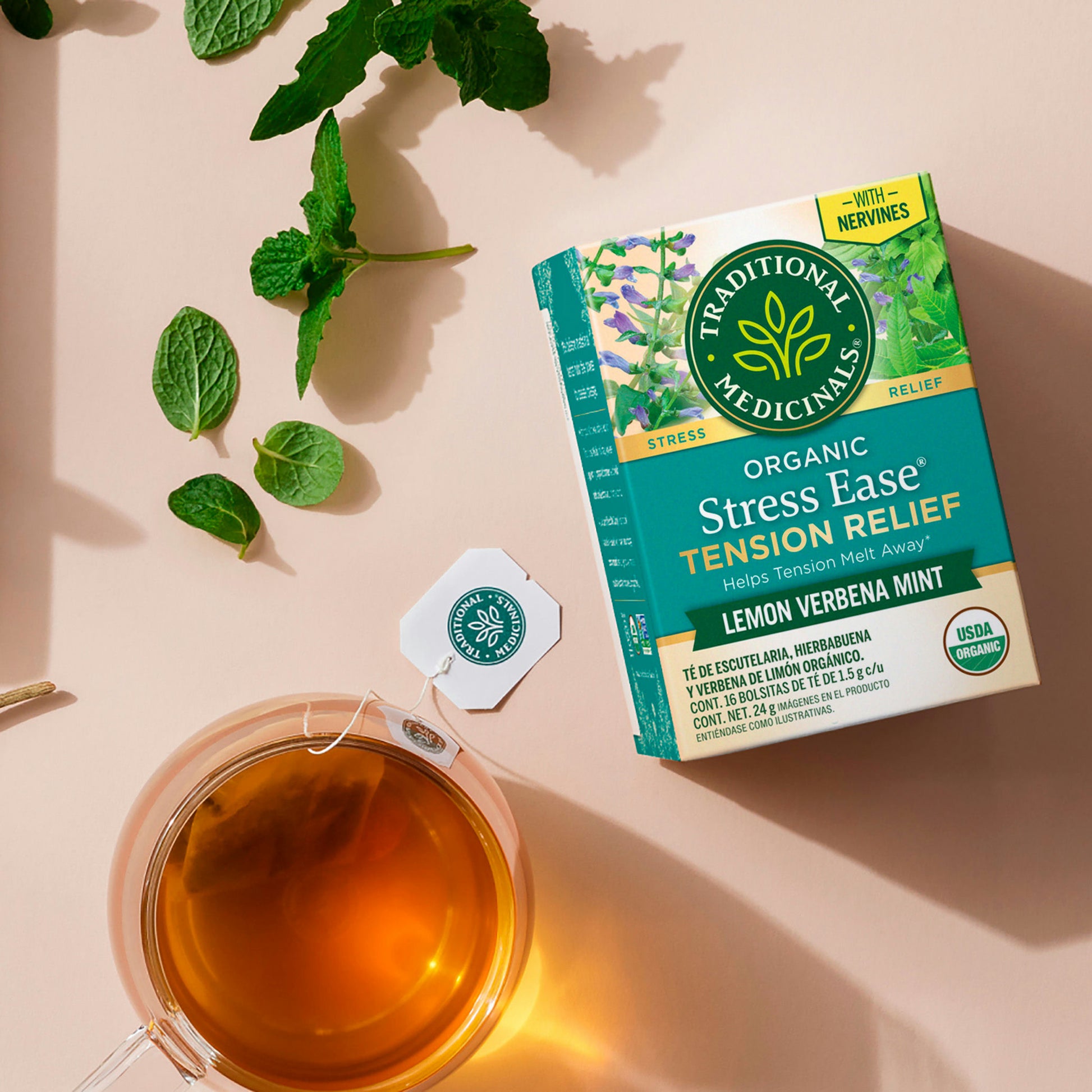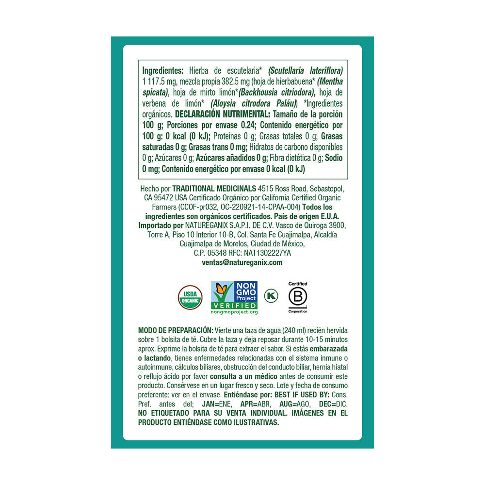 El Stress Ease Tension Relief de Traditional Medicinals es una infusión orgánica elaborada con una mezcla equilibrada de hierbas tradicionales como escutelaria, verbena de limón, hierbabuena y mirto limón cuidadosamente seleccionadas para ayudarte a reducir el estrés ocasional, aliviar la tensión física y mental, y promover una sensación de bienestar general.
